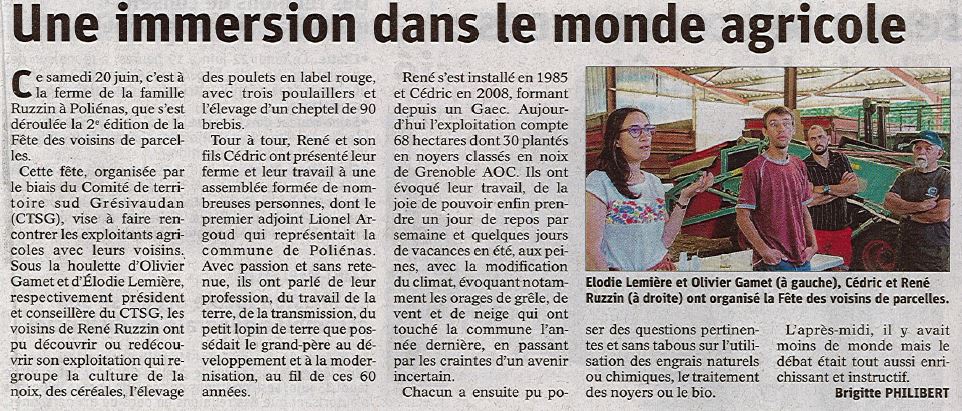 Le mitage urbain a entraîné une proximité entre terres agricoles et habitations provoquant certaines crispations entre le monde agricole et les citoyens. Dans ce cadre, le Comité de Territoire Sud Gresivaudan a souhaité mettre en place des temps d’échanges entre un exploitant agricole et son voisin. De cette idée, est née la Fête des Voisins de Parcelles, qui consiste à un agriculteur à inviter les voisins ayant une parcelle mitoyenne avec lui. L'objectif de ce moment est d'échanger sur le métier et ses pratiques agricole autour d’un moment de convivialité.