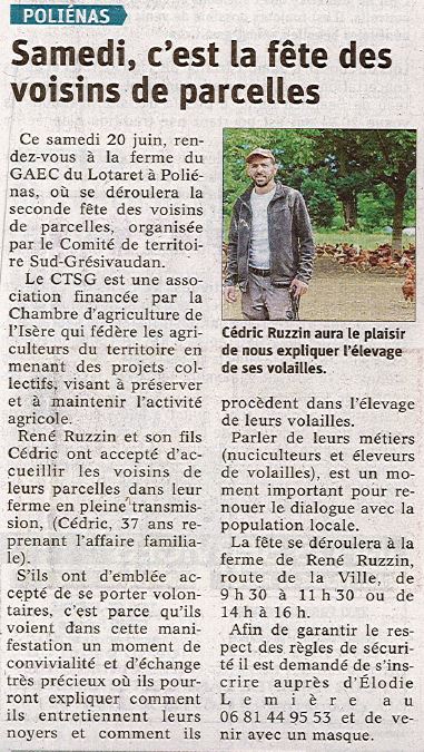 De plus en plus questionnés sur leurs pratiques agricoles Cédric et René se sont portés volontaires pour accueillir cette Fête. Leur exploitation est située au sein même du village de Poliénas répartie sur 68 hectares où ils élèvent des poulets fermier label rouge, un cheptel de 90 ovins et cultivent 30 hectares de noyers AOC de Grenoble. René s'est installé depuis 1985 sur la commune et a été rejoint par son fils Cédric 2008 en créant le GAEC du Lotaret. L'année prochaine René partira à la retraite et laissera Cédric aux commandes de l'exploitation.